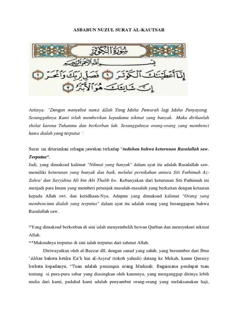 Asbabun nuzul suarah ini dirturunkan ada dua pendapat. Dalam buku tafsir al quraan atas surat pendek prof. Berikut ini terjemahan asbabun nuzul dan tafsir surat al kautsar. Alangkah baiknya baca dulu ayat tentang kematian agar bisa menambah wawasan lagi hehe. Newer post older post home. Pendapat pertama mengatakan bahwa surat al kautsar mengarah pada nama telaga nabi muhammad yang ada di syurga.