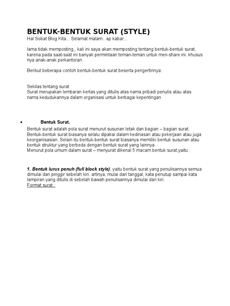 Contoh bentuk bentuk surat. Sman1garut at schid fax. Setiap kantor atau lembaga terkadang tidak sama dalam memaikai bentuk surat tergantung kantor dan lembaga itu sendiri. Contoh bentuk surat full block style. Bentuk surat adalah pola surat yang memiliki susunan bagian struktur bagian. Surat digunakan untuk memberikan informasi secara tertulis dari suatu suatu pihak ke pihak lainnya. Merdeka no91 kota garut.