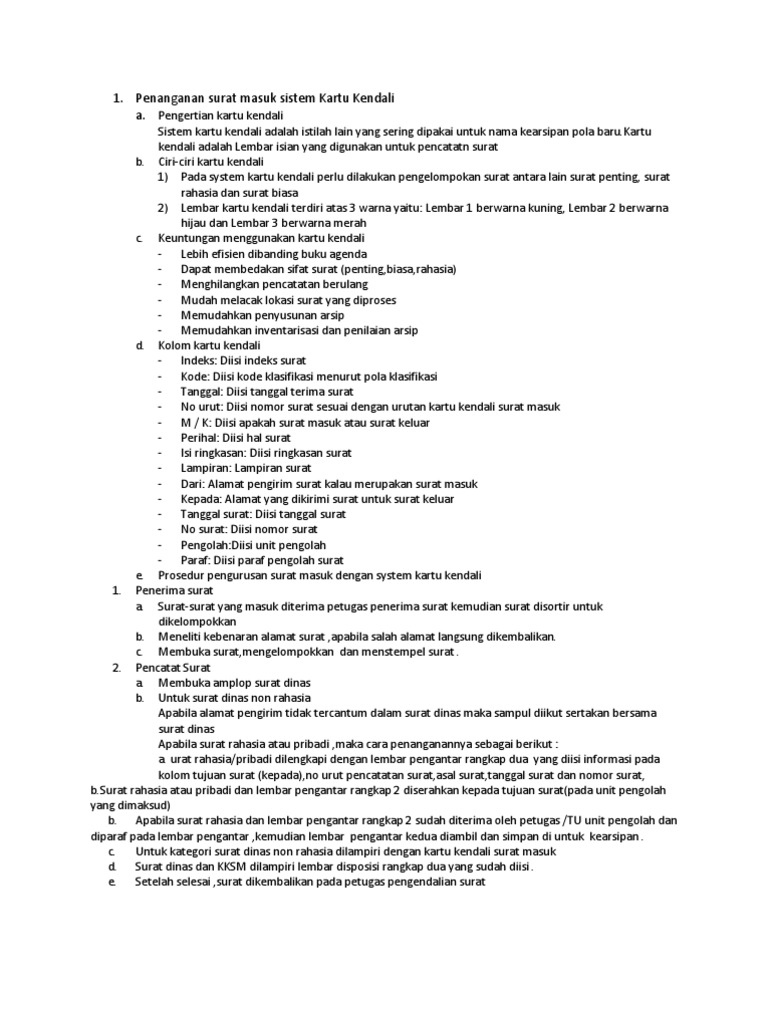 Contoh kartu kendali surat masuk. Prosedur surat masuk penting sistem kartu kendali berikut ini akan dijelaskan prosedur penanganan surat masuk penting menggunakan kartu kendali. Surat penting diserahkan kepada suatu kerja pengarah untuk diprses lebih lanjut. Agenda surat masuk no urut tanggal terima surat diterima dari isi ringkas. Penerimaan surat sebelumnya telah dibuat ketentuan atau peraturan di tiap instansi bahwa semua surat masuk dan keluar diterima melalui satu pintu yaitu unit kearsipan. Diisi nomor surat sesuai dengan urutan kartu kendali surat masuk. Kartu kendali yang digunakan dalam proses pengurusan surat masuk dan surat keluar ini berupa kertas tipis dengan ukuran 10 x 15 cm yang berisi kolom kolom untuk mencatat keterangan keterangan tertentu serta untuk mengendalikan surat.