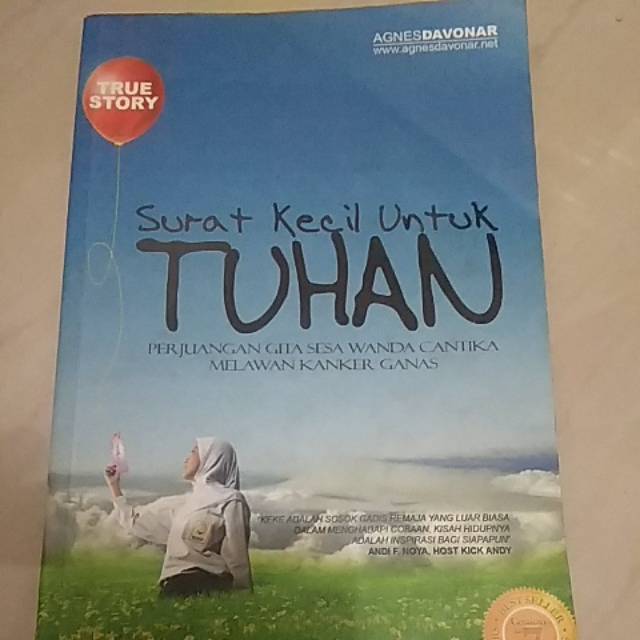 Identitas buku judul buku novel. Namun karena agnes memiliki ketekunan dan antusiasme ia terus berkembang menjadi seorang penulis yang melahirkan lima novel online dan 42 cerita pendek. Itulah amanat novel surat kecil untuk tuhan yang dapat admin kumpulkan. Inandra published tahun terbit. Resensi novel surat kecil untuk tuhan kisah yang ditulis oleh agnes davonner ini menggambarkan kisah nyata dari seorang gadis remaja yang berjuang melawan kanker ganas yang ia derita. Vii232 harga buku.