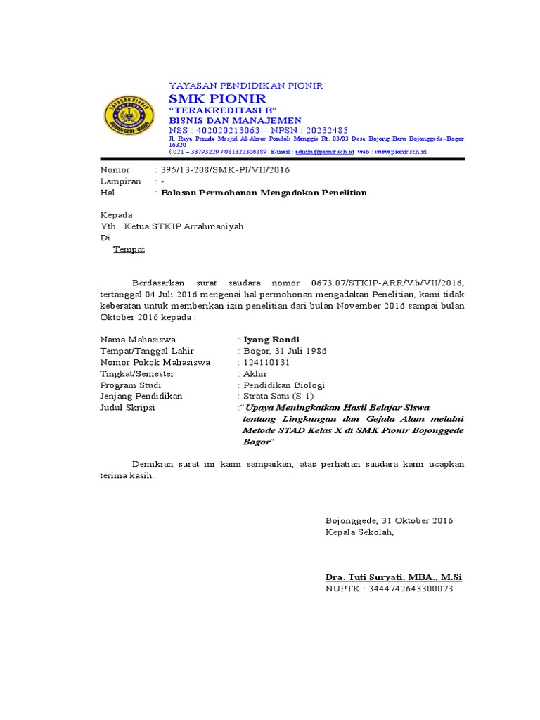 Contoh surat balasan observasi. Contoh surat balasan penelitian saat ini anda lagi melakukan studi untuk melakukan penelitian maka kami berikan ini supaya anda bisa memberikan balasan untuk penelitian sehingga anda memilik toko bisa memberikan surat balasan untuk kepala jurusan supaya untuk studi ini layak untuk diteruskan penelitiannya. Secara umum format surat izin observasi sekolah memuat informasi informasi sebagai berikut. Contoh surat keputusan organisasi 1. Contoh surat balasan penelitian dari kampus untuk penyusunan tesis. Contoh surat delivery order 1. Contoh surat balasan surat balasan merupakan surat yang berisikan balasan surat yang sebelumnya dikirim atau dibuat.