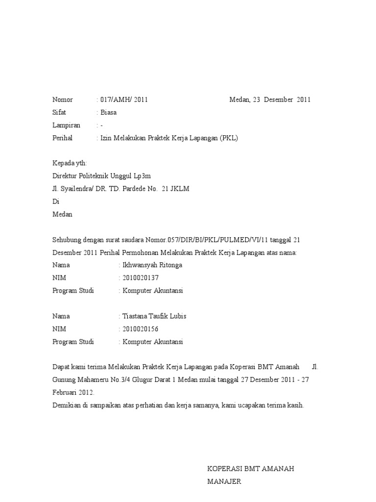 Contoh surat balasan pkl. Pengertian surat lamaran kerja magangpklprogram bina magang. Mohon maaf apabila terdapat kesamaan namatempatinformasi lain karena surat yang dibuat hanya bertujuan sebagai percontohan tanpa ada maksud apapun. On selasa 06 januari 2015 2250 kop surat sekolah medan 14 agustus 2012. Contoh surat balasan pkl ini kami buat untuk anda semua supaya anda bisa langsung menggunakan untuk bisa memberikan kepada tempat sekolah mereka sehingga perusahaan bisa menuliskan surat balasan pkl ini untuk bisa langsung memberikan pekerjaan kepada siswa yang sudah melakukan pkl di perusahaan tersebut. Untuk itu langsung saja surat balasan pkl dibawah ini selengkapnya untuk format surat. Dan anda dapat mendownload contoh contoh surat balasan magang secara gratis tanpa harus daftar terlebih dahulu.