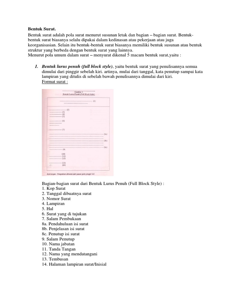 Kemudian unutk baris keduannya menjorok masuk lima hentakan. Bentuk surat indented style bentuk lekuk sementara untuk bentuk surat indented style perbedaannya pada penulisan alamat tujuan yang ditulis secara bergerigi. Bentuk surat lekuk dan bentuk surat setengah lurus tidak jauh berbeda. Secara rinci menurut agus sugiarto 20052 pengertian surat adalah instrumen untuk penyampaian pesan dari ke kubu lain dengan syarat tertentu seperti pemakaian kertas pemakaian bentuk adanya notasi dan kode menggunakan bahasa yang spesifik dan pembubuhan tanda tangan. Pada baris pertama akan membentuk lekuk surat menjorok ke dalam yang di mulai dari margin kiri. Adapun perbedaannya terletak pada penulisan alamat tujuan.