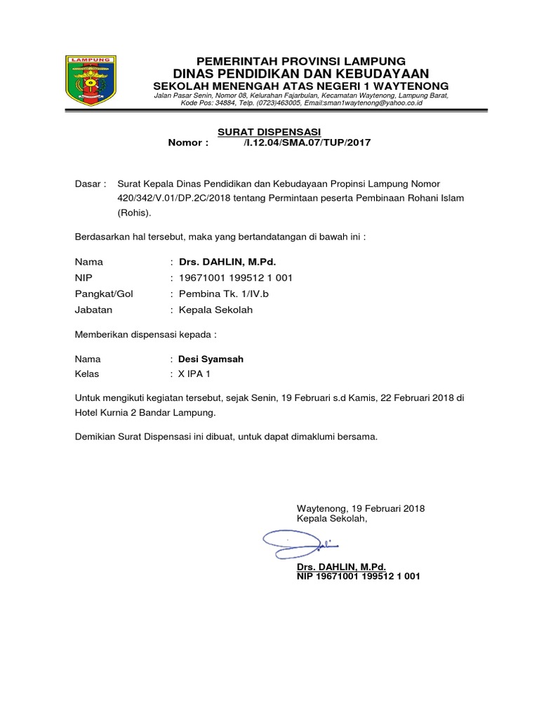 Contoh surat dinas pengertian dari surat dinas adalah surat resmi yang dibuat oleh instansi atau lembaga untuk keperluan dinas baik pemerintah maupun lembaga swasta. Contoh surat dispensasi sekolah untuk mengikuti acarasurat dispensasi adalah surat yang dibuat untuk dapat diberikan kepada seseorang ataupun kelompok perusahaan instansi sekolah lembaga dll agar si pembuat surat diperkenankan untuk meninggalkan tugas utamanya sementara karena ada tugas atau kegiatan yang lebih penting.