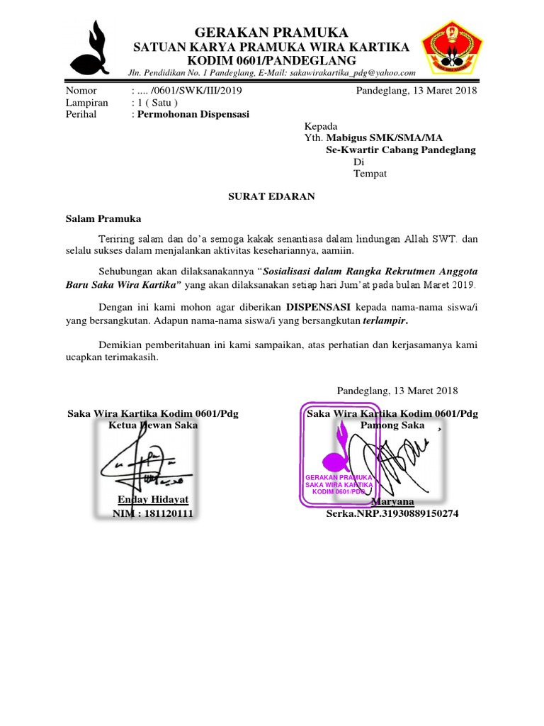 Contoh surat dispensasi pramuka. Demikianlah contoh surat dispensasi yang termasuk dalam jenis surat secara resmi ini. Bambang subardiana utama nip. Surat dispensasi pramuka merupakan surat yang dibuat untuk memohon keringanan izin tidak hadir karena mengikuti kegiatan pramuka pada hari belajar efektif misalnya ikut perkemahan mengikuti lomba baris berbaris lbb jambore nasional atau mengikuti kegiatan lainnya yang berhubungan dengan kepramukaan. Fb twitter wa line pinterest g linkedin. 561711 jtentang permohonan dispensasi dalam rangka panitia kegiatan perkemahan wira karya daerah kalimantan timur tahun 2014 yang akan dilaksanakan pada. Contoh surat dispensasi kegiatan pramuka.