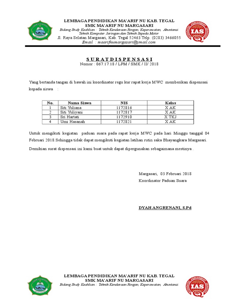Contoh surat dispensasi ada kalanya seseorang harus terbebas dari tanggung jawab untuk sementara waktu dikarenakan sesuatu hal. Itulah mengenai beberapa contoh surat dispensasi sekolah untuk berbagai kepentingan yang dibuat oleh pihak sekolah sebagai bahan referensi untuk mengetahui bagaimana surat dispensasi yang baik dan resmi. Contoh surat ijin permohonan dispensasi by fendi kurniawan september 22 2019 0 comments. Dispensasi kegiatan dispensasi lomba. Jlngunung raung sumbergading sumberwringin 68287. Terima kasih atas perhatiannya.