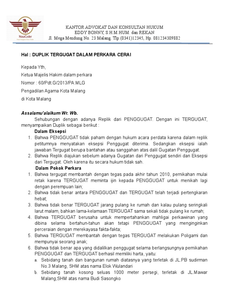 Contoh surat duplik perceraian. Contoh surat duplik pusat studi dan konsultasi hukum pskh achmad zainuddin shi mhum. Serta yurisprudensi yang masih berlaku dibenarkan adanya perceraian. Contoh duplik tergugat dala perkara cerai gugat perihal. Kepada yang terhormat majelis hakim pemeriksa perkara. Sama dengan sidang replik sebelumnya dimana dalam persidangan ini hanyalah penyerahan surat replik tergugat jadi sidang berlangsung singkat hanya 5 menit saja lalu sidang ditutup dan akan diadakan lagi 1 minggu kemudian dengan acara sidang pembuktian dan saksi dari penggugatsusan. Sanyu no8 jakarta pusat berdasarkan surat kuasa khusus tertanggal 3 maret 2012 berkas terlampir yang.