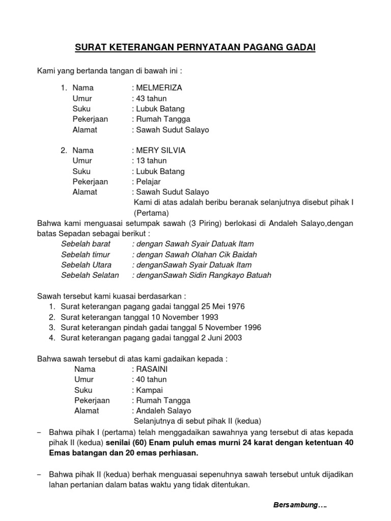 Contoh surat gadai sawah. Silahkan ambil contoh surat ini mungkin cocok dan pas untuk anda yang sedang ada urusan gadai tanahlahan. Uang gadai sawah diserahkan langsung dari pihak kedua kepada pihak pertama sebesar rp. Contoh surat gadai surat keterangan gadai. 00 jumlah uang dalam huruf dimana pihak kedua akan membayarkan keseluruhan uang tersebut secara sekaligus bersamaan dengan penandatanganan surat perjanjian gadai ini dan dengan demikian surat perjanjian ini berlaku sebagai tanda bukti pembayaran yang sah atas uang gadai tanah termaksud. Surat gadai sawah rabu 17 juli 2013. Contoh surat perjanjian gadai sawah diatas ditulis menggunakan kaidah penulisan yang resmi dan benar sehingga dapat dijadikan referensi jika akan membuat surat perjanjian mengenai gadai.