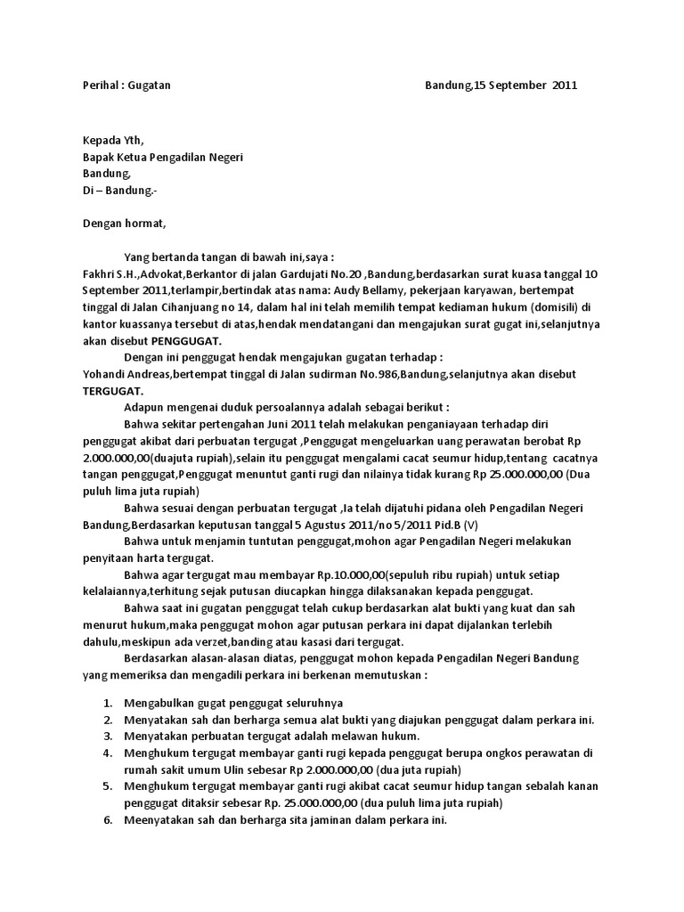 Contoh dan cara membuat surat gugatan fauzie yusuf hasibuan dalam bukunya yang berjudul praktek hukum acara perdata di pengadilan negeri menyatakan persyaratan menegnai isi gugatan dapat kita jumpai dalam pasal 8 nomor 3 reglement op de burgerlijke rechts vordering rv. Contoh surat gugatan ptun surat gugatan mataram 25 november 2006 kepada yth. Contoh gugatan di pengadilan tata usaha negara. Untuk dapat mendownload contoh surat gugatan ptun dalam format doc silahkan klik link berikut ini. Contoh surat gugatan ptun bandung 21 mei 2015. Surat gugatan merupakan salah satu contoh dari sekian banyak surat resmi sehingga ketika anda menulis atau membuat surat ini maka anda harus benar benar memperhatikan mengenai bahasa dan diksi yang anda gunakan.