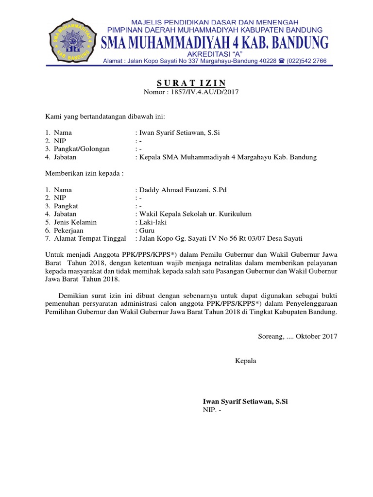 Contoh surat izin dari atasan langsung ditulis oleh operator sekolah. Sehubungan hal tersebut diatas bersama ini kami selaku atasan langsung memberikan ijin kepada namanama sebagaimana terlampir untuk menjadi anggota pps kpps dalam kegiatan pemilu tahun 2014.
