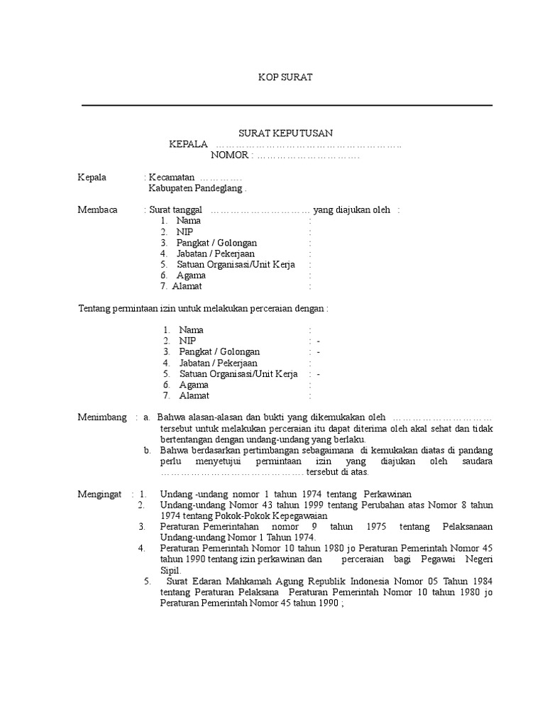 Karena jika tidak dipenuhi maka selain pengadilan tidak akan melanjutkan proses persidangan tidak adanya surat izin cerai dari atasan dapat bermasalah di kemudian harinya. Contoh format surat izin cerai dari atasan bagi pns docx salah satu syarat administrasi bagi pegawai negeri sipil pns yang ingin mengajukan gugatan perceraian adalah surat izin cerai dari atasan. Contoh surat permohonan izin cerai dari atasan. Contah format surat izin cerai dari atasan bagi pns. Yha apabila selalu terjadi hal hal yang tidak baik dalam pernikahan solusi terakhir adalah perceraian. Lampiran surat edaran kepala badan administrasi kepegawaian negara nomor.