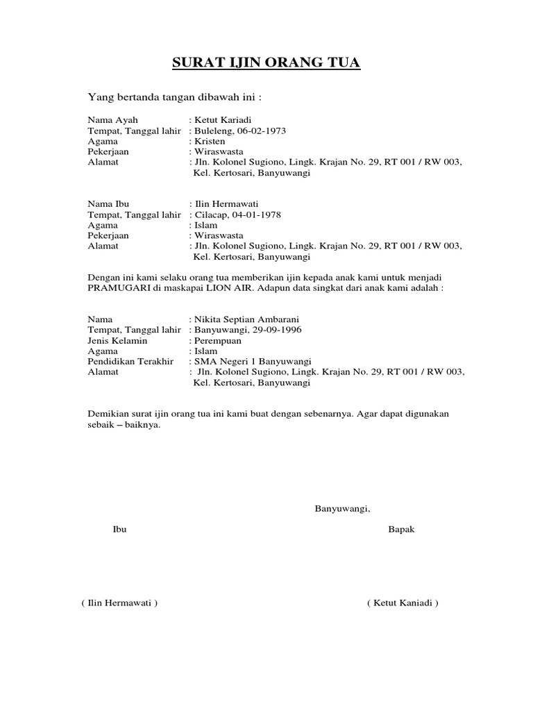 Contoh surat izin orang tua menjadi pramugari. Surat persetujuan orang tua untuk menjadi polisi contoh surat izin orang tua 20160930152813 1 surat pernyataan orang tua bayi farahdiba auliyah. Contoh surat izin orang tua untuk bekerja di luar negeri pembuatan e paspor anak di surabaya its okay to be weird. Kenapa demikian tidak lain dan tidak bukan karena surat memiliki bukti fisik yang bisa digunakan sebagai bukti di kemudian hari. 15 contoh surat izin orang tua untuk berbagai keperluan penggunaan surat memang tidak akan pernah ada habisnya. Walaupun sudah tersedia berbagai komunikasi canggih dan modern sekarang ini namun penggunaan surat tetap saja tidak bisa ditinggalkan. I kajian terhadap jam kerja dan hak h.