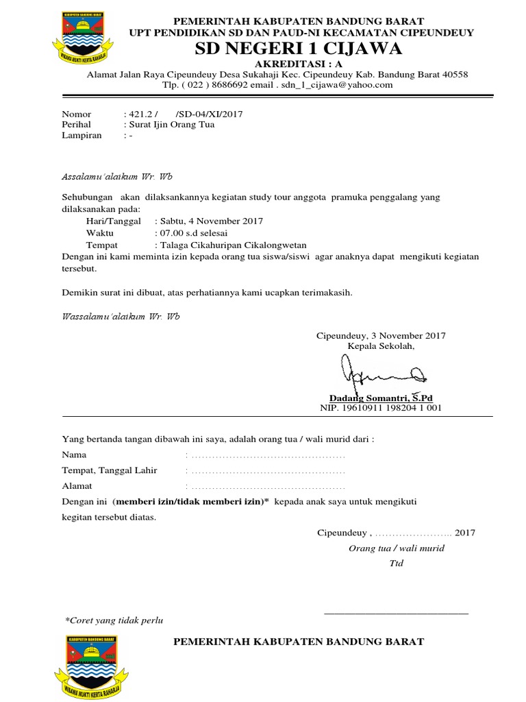 Dalam kegiatan sekolah smasmkmasmpmts atau bahkan sd sering kali kita jumpai adanya sebuah study tour wisata atau bisa juga ziarah wali songo. Sehubungan dengan diadakannya kegiatan di luar kota study tour. Sehingga berbagai contoh surat izin orang tua akan anda butuhkan untuk memenuhi persyaratan persyaratan keperluan tersebut. Contoh surat ijin orang tua untuk study tour surat ijin orang tua. Surat izin orang tua sering digunakan untuk berbagai keperluan seperti untuk melamar kerja mengikuti kegiatan kegiatan sekolahkampus pembuatan visa hingga digunakan sebagai surat izin menikah.