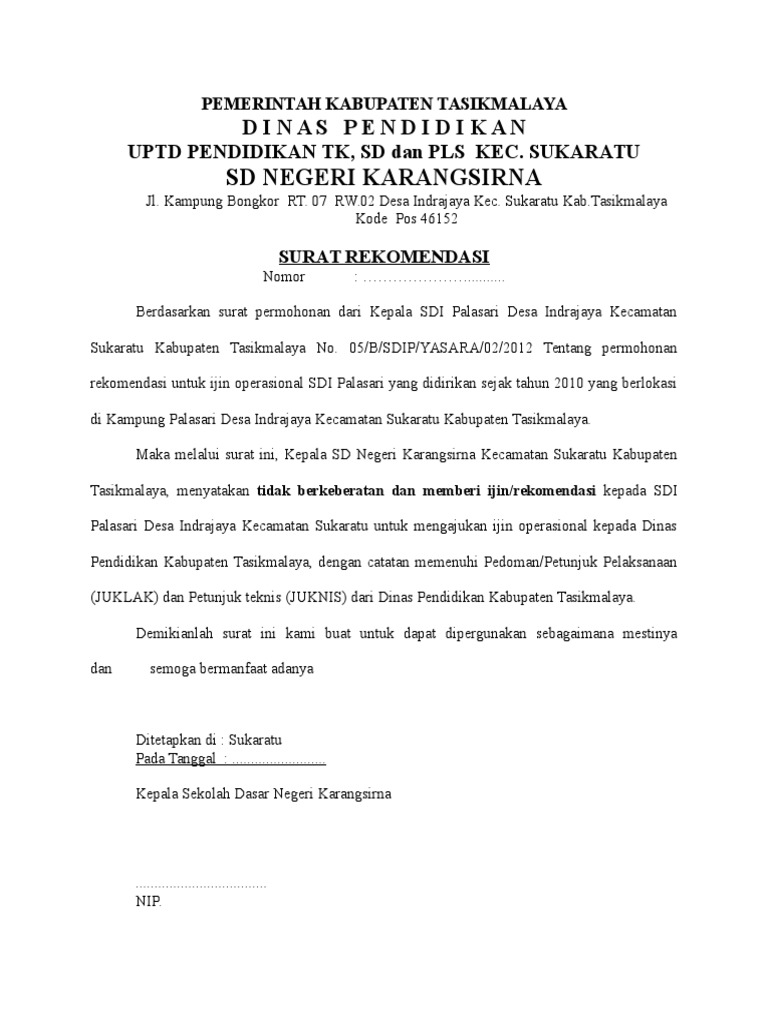 Contoh surat izin pendirian sekolah. Inilah surat rekomendasi izin pendirian sekolah. Contoh dan format penulisan surat rekomendasi sekolah dari kepala desa untuk persayaratan mengajukan permohonan izin operasional pesantren ke kementrian agama. Contoh surat izin pendirian sekolah format profesional sebagai referensi dalam membuat surat izin yang baik dan resmi agar dapat diterima. Baik itu surat yang dipergunakan oleh perusahaan instansi pemerintahan lembaga organisasi dan perseorangan. Contoh surat rekomendasi pendirian sekolah baru pada saat ingin mendirikan sebuah sekolah pasti akan banyak izin dan persyaratan yang harus di urus dan diselesaikan. Demikian beberapa contoh surat ijin pendirian sekolah baru untuk berbagai jenjang.