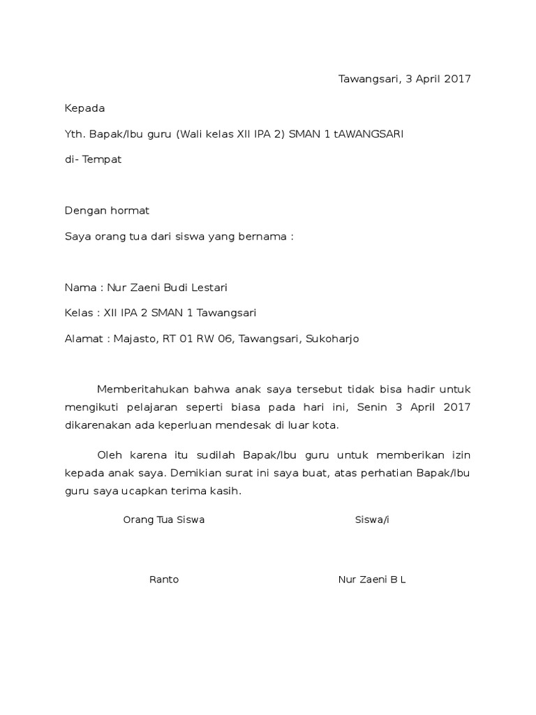 Contoh surat izin tidak masuk sekolah karena pergi memang dibutuhkan sekali untuk anda yang tidak bisa mengikuti pelajaran sekolah untuk suatu keperluan keluarga ataupun pergi keluar kota. Softgaleri adalah blog yang berbagi informasi kode administrasi dalam surat menyurat administrasi aplikasi dan administrasi guru yang mana file berikut ini adalah kumpulan dari berbagi sumber tentang contoh surat izin pergi sekolah yang bisa bapakibu gunakan dan diunduh secara gratis dengan menekan tombol download biru dibawah ini. Lengkap dengan cara membuat surat izin sekolah yang baik dan benar. Gimana cara membuat contoh surat izin sakit tidak masuk kuliah. Contoh surat izin pergi sekolah. Subang 10 juli 2018.