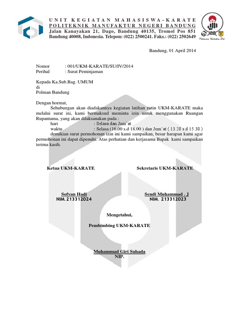 Terdapat kop surat tanggal dan tempat surat dibuat kepada siapa surat ditujukan isi surat peminjaman tempat yang jelas mengenai kapan dan untuk apa tempat akan dipinjam dan digunakan serta tercantum dengan jelas siapa yang membuat surat peminjaman. Berikut contoh surat pengajuan ijin. Sebuah surat permohonan peminjaman biasanya ditujukan untuk pinjam meminjam alat yang digunakan sebuah organisasi atau instansi resmi. Tetapi kalau yang memohon izin adalah tetangga ke sesama tetangga saya rasa tidak perlu menggunakan surat menyurat. Contoh surat peminjaman barang dalam suatu ruang lingkup yang formal tentu saja harus menggunakan media komunikasi yang resmi seperti surat termasuk saat melakukan peminjaman barang. Contoh surat permohonan pinjam tempat kegiatan pelatihan pengurus masjid istiqlal tidak beri izin peminjaman tempat.
