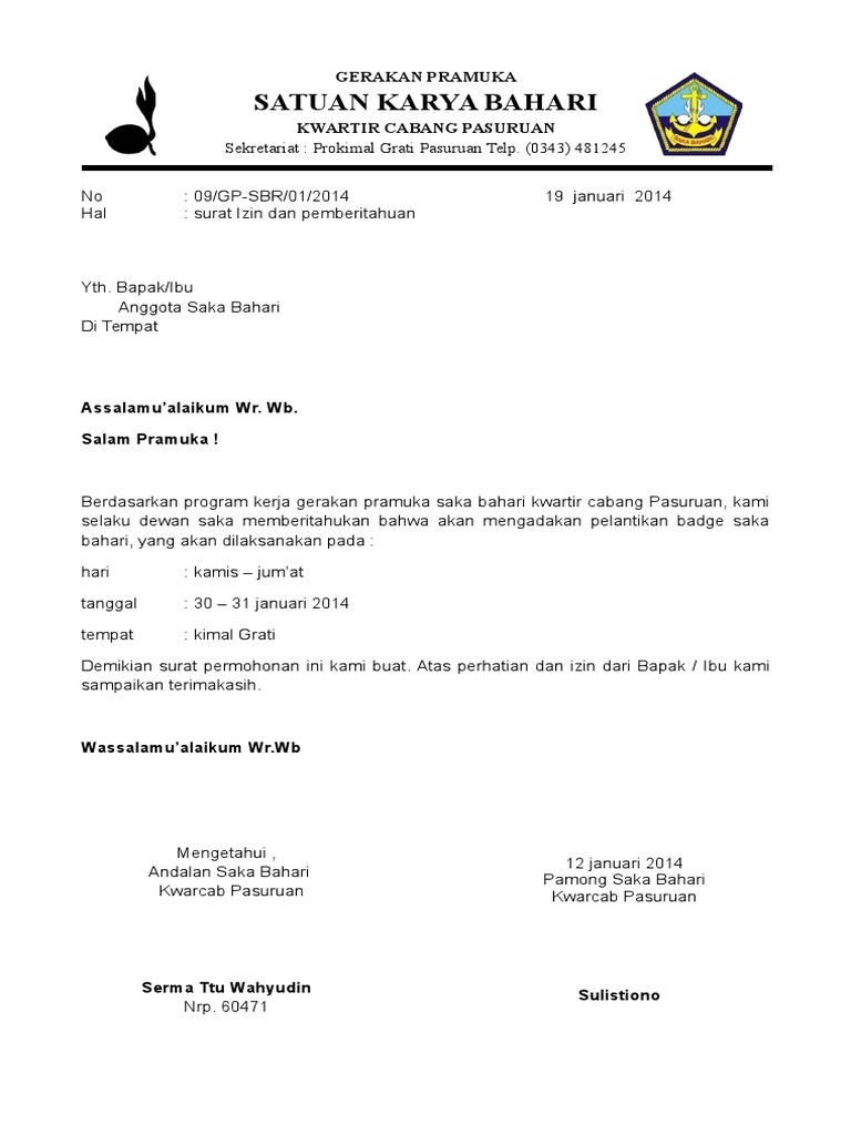 Contoh surat izin pramuka. Contoh surat izin orang tua untuk mengikuti kegiatan pramuka ada kalanya kita mengikuti sebuah kegiatan yang memerlukan izin dari orang tua. Kenapa demikian tidak lain dan tidak bukan karena surat memiliki bukti fisik yang bisa digunakan sebagai bukti di kemudian hari. Jalan raya sejahtera no 189 kode pos 76853. Walaupun sudah tersedia berbagai komunikasi canggih dan modern sekarang ini namun penggunaan surat tetap saja tidak bisa ditinggalkan. Kwartir cabang kutai timur. Selamat datang di blog pramuka rabu 13 januari 2010 contoh surat izin orangtua gerakan pramuk.