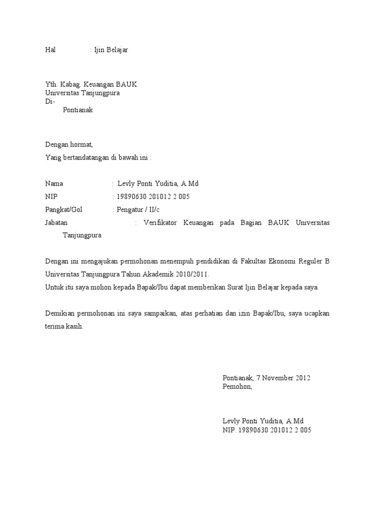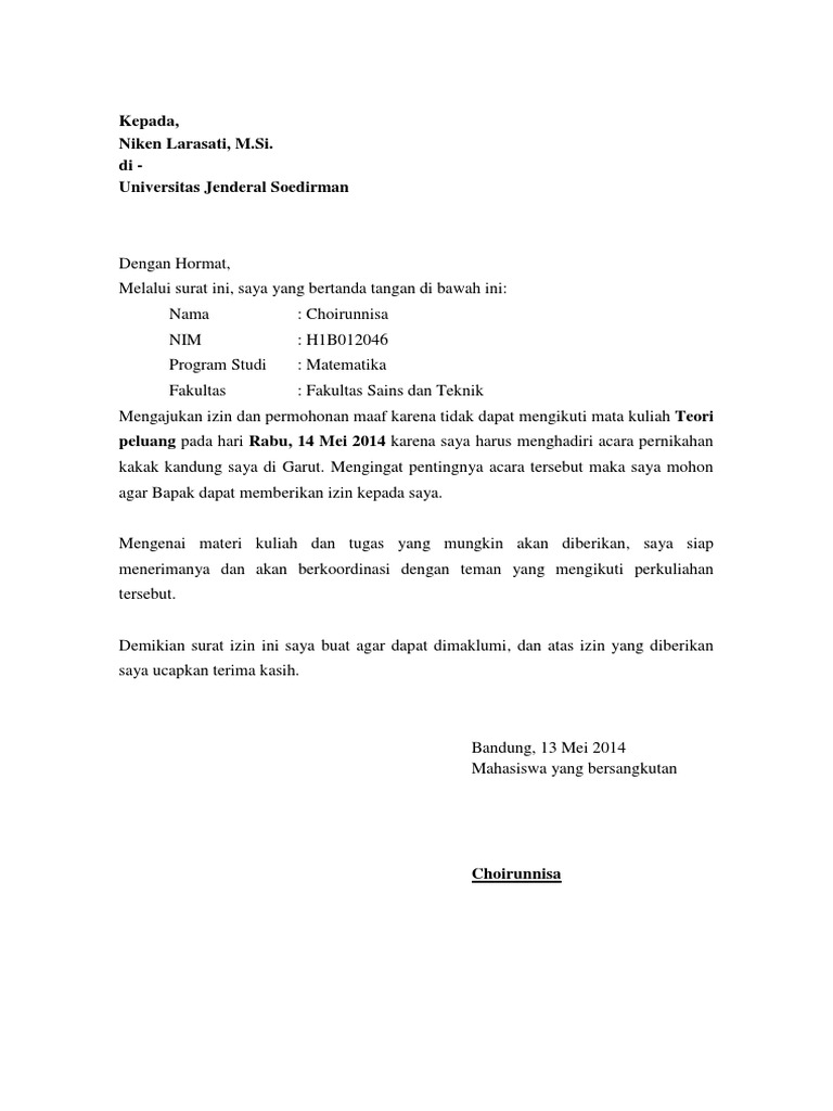 Contoh surat izin tidak masuk kuliah doc. Kali ini materi yang akan kita bahas adalah mengenai contoh surat izin tidak masuk kuliah untuk mahasiswa. Sekian penjelasan mengenai surat izin kuliah pada kali ini. Contoh surat izin tidak masuk kuliah terima kasih saya ucapkan kepada para pembaca yang sudah mau meluangkan waktunya untuk mengunjungi situs ini. Okde deh buat temen temen mahasiswa yang ingin mengajukan izin tidak masuk kuliah mudah mudahan contoh surat izin tidak masuk kuliah karena acara keluarga berikut bisa membantu yhaa. Semoga dengan penjelasan singkat tadi menambah referensi bagi anda semua. Asal tak bolos atau tidak masuk lebih dari empat kali di tiap mata kuliah maka mereka merasa aman.