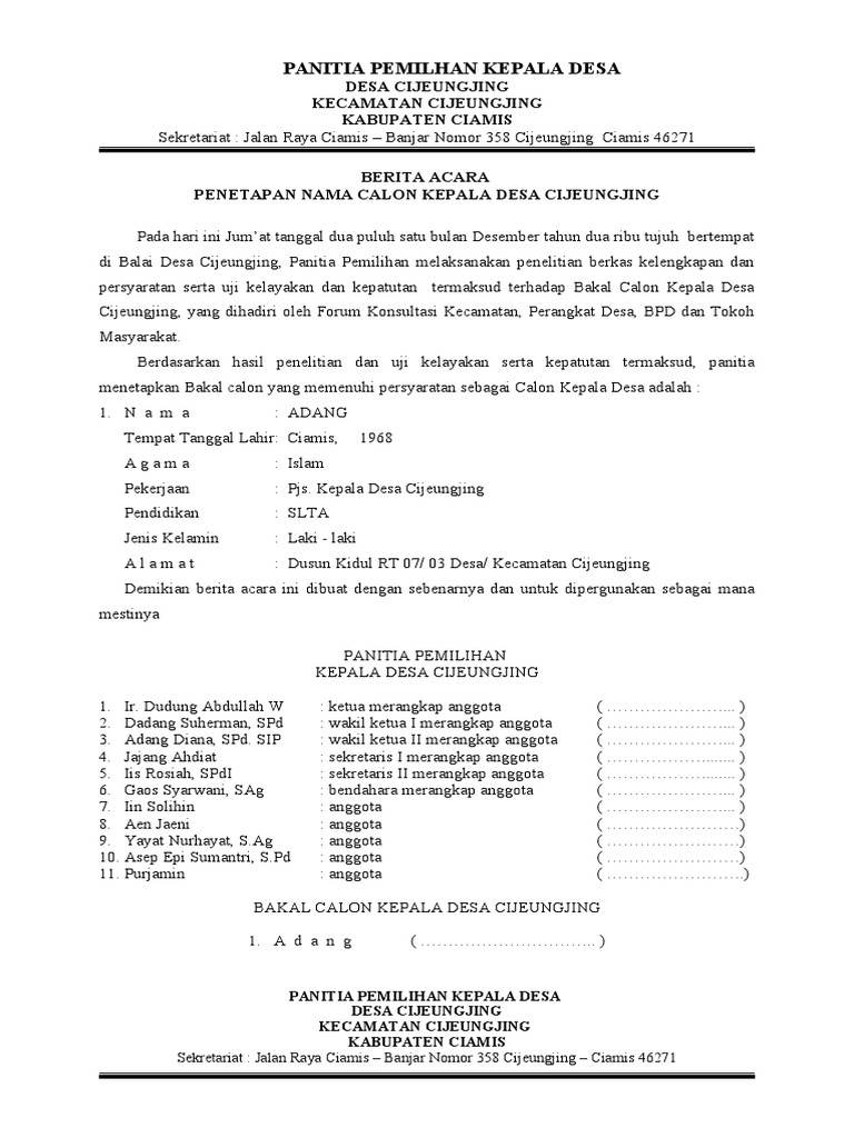 Contoh berita acara pemungutan suara pilkades. Surat keputusan diperlukan bilamana seorang pemimpin atau atasan membuat keputusan di suatu pihak atau kelompok. Contoh surat usulan pengesahan dan pengangkatan ca. Pembacaan keputusan bpd tentang kesepakatan penetapan peraturan desa tentang rancangan rencana kerja pemerintah desa kaligelang tahun 2016 oleh kepala desa. Jika ada yang ingin anda sampaikan silahkan anda dapat menggunakan kolom komentar dibawah artikel ini atau melalui saluran kontak kami. Surat keputusan ini mulai berlaku sejak tanggal ditetapkan dengan catatan apabila di kemudian hari ternyata ada kekeliruan dalam surat keputusan ini akan diadakan pembetulan sebagaimana mestinya.