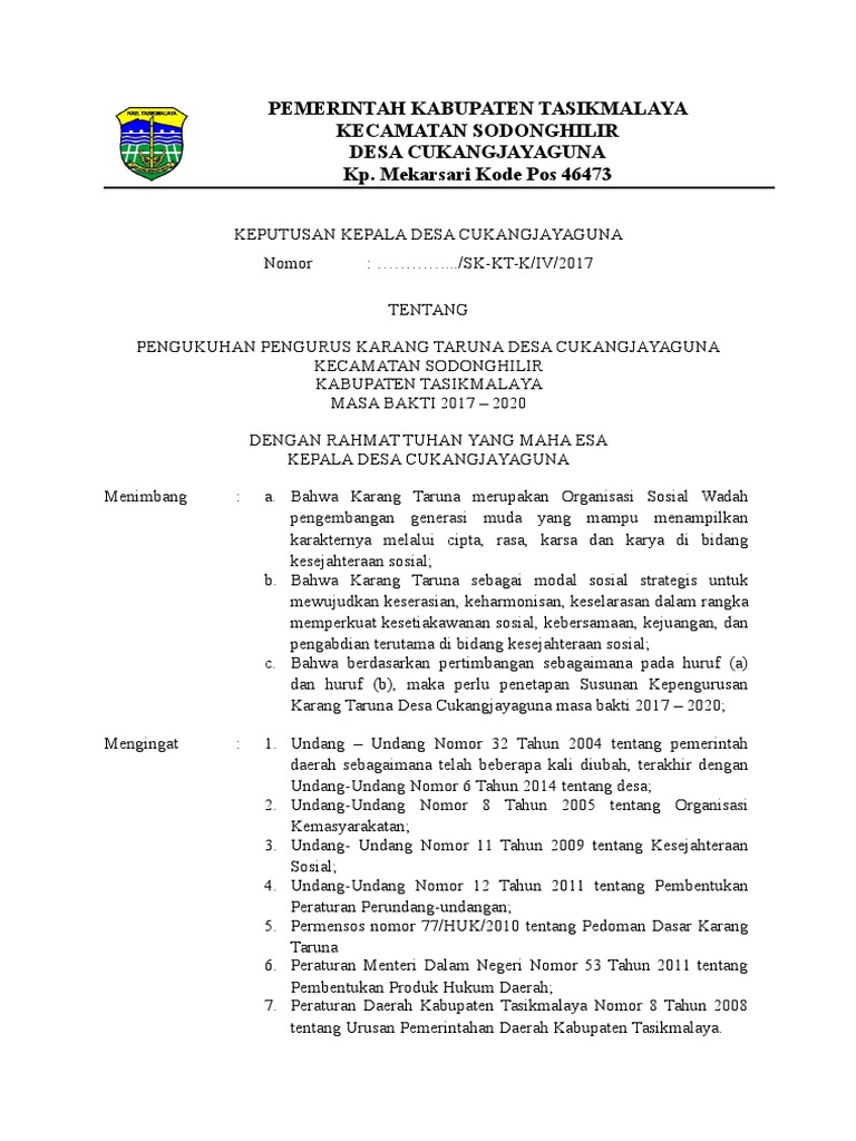 Bahwa karang taruna merupakan modal sosial strategis guna mewujudkan keserasian keharmonisan keselarasan dalam rangka memperkuat kesetiakawanan sosial kebersamaan perjuangan dan pengabdian di bidang kesejahteraan. Surat undangan dengan tujuan rapat karang taruna merupakan salah satu surat resmi karena pada surat undangan rapat terdapat ada kepala surat dan berstempel organisasi. Sk karang taruna desakelurahan adalah surat keputusan yang ditetapkan oleh kepala desalurah dalam rangka menetapkan pengurus karang tarunapemuda pemudi di wilayah desakelurahan. Berdasarkan pertimbangan sebagaimana dimaksud huruf a perlu mengangkat kepengurusan karang taruna dalam suatu keputusan kepala desa. Academiaedu is a platform for academics to share research papers. Namun tidak menutup kemungkinan dengan alasan tertentu seseorang memutuskan untuk mengundurkan diri dari perusahaan yang bersangkutan.