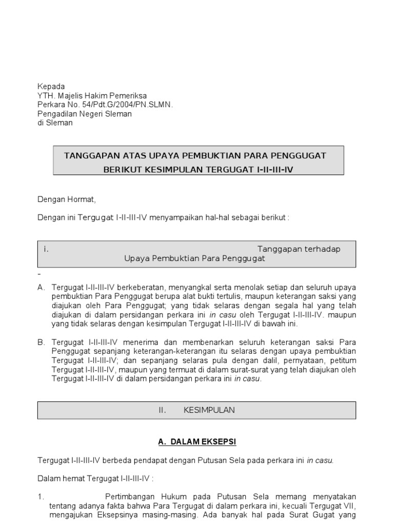Advokatpengacara dan penasihat hukum pada ganlid partners law firmberdasarkan surat kuasa khusus pada tanggal 28 januari 2012 surat kuasa terlampir dalam hal ini bertindak untuk dan atas nama serta mewakili eva dwinopianti selaku penggugat perkenankanlah bersama ini kami menyampaikan kesimpulan dalam perkara perdata no. Dari adanya surat gugatan jawaban replik duplik keterangan para saksi dan kesimpulan diambil intisari nya saja untuk dijadikan suatu kesimpulan. Bahwa tergugat di dalam jawabannya secara tertulis tertanggal 21 mei 2011 yang disampaikan di persidangan melalui kuasa hukumnya menyatakan mengabulkan gugatan cerai penggugat dan menjatuhkan talak satu bain sughra kepada penggugat. Pada sidang kesimpulan ini dilaksanakan hanya 1 hari saja dimana penggugat dan tergugat keduanya menyerahkan surat kesimpulan secara bersamaan dalam 1 hari yang ditentukan oleh hakim. Bahwa setahu saksi penggugat dan tergugat mempunyai harta bersama berupa 1 sepeda motor2 3 tiga ekor sapi besar namun sekarang tidak tahu lagi masi ada atau tidak 3 sewa gadai tanah rp. Kesimpulan penggugat gugatan hutang kpd bahar kesimpulan suj 1 proposal posbakum.