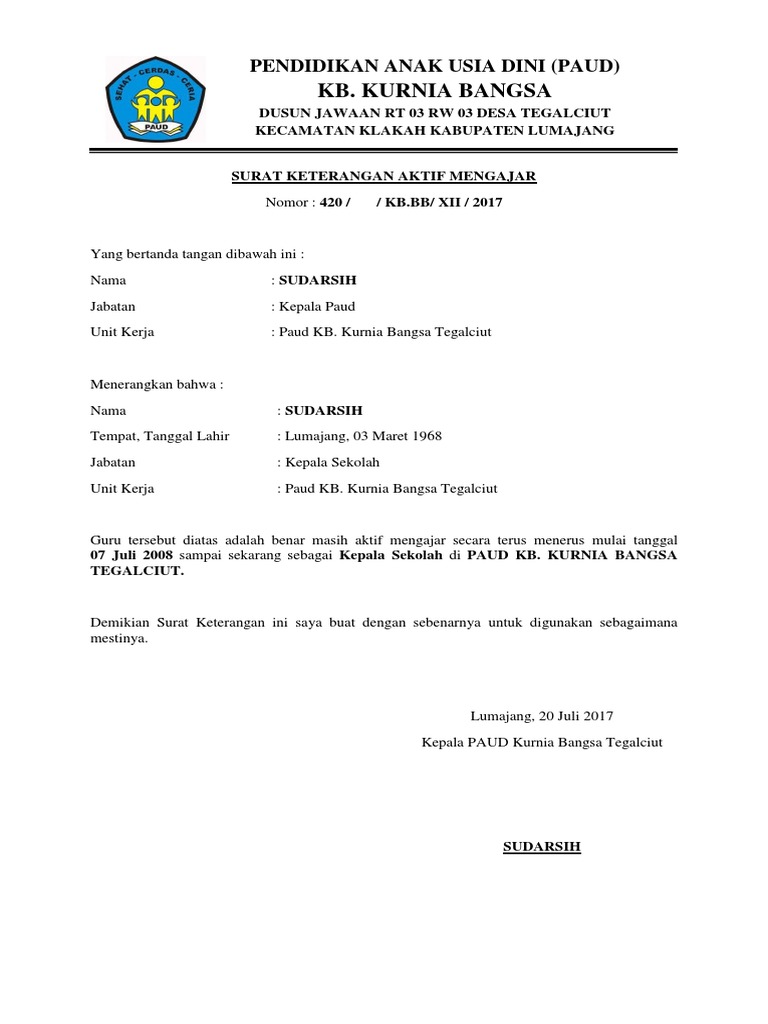 Taman kanak kanak desa purnomo. 89 bandung jawa barat indonesia. Surat keterangan aktif mengajar no18kamyiixi2018. Contoh surat keterangan aktif mengajar yang baik dan benar. Download 1430 kb info lengkap. Surat keterangan aktif mengajar sebagai seorang pengajar anda diharuskan untuk memiliki banyak kemampuan bukan hanya kemampuan dalam mengajar anak didik saja namun juga kemampuan dalam melengkapi dokumen pendukung dalam mengajar yaitu misalnya silabus rpp dan sebagainnya.