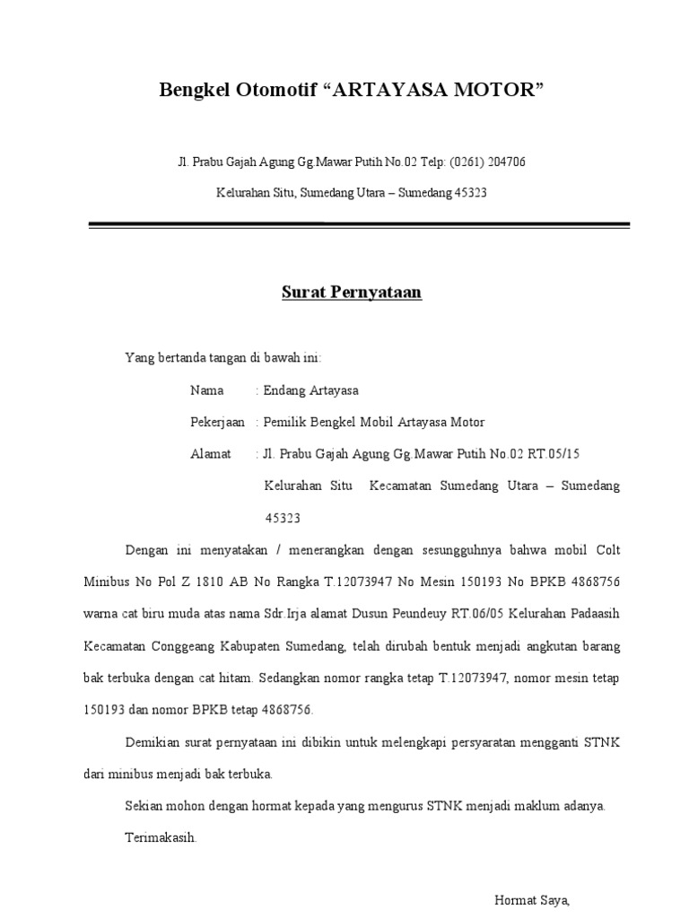 Contoh surat keterangan bengkel. Nah disini saya akan kasih contohnya surat keterangan tersebbut sehinga anda bisa membuatnya sendiri dengan mudah. Menerangkan bahwa benar dari pengetahuan kami yang berdasarkan surat keterangan dari dinas tegalrejo nomor. Demikian surat keterangan bengkel ini di buat agar di pergunakan sebagai mana mestinya. Contoh surat keterangan usaha bagi seorang pemilik usaha atau menjalankan usaha sendiri tentu memiliki banyak dokumen dan surat surat yang dibutuhkan. Contoh surat pelimpahan pekerjaan. Perlu admin beritahukan bahwa portal website kumpulan contoh surat berisi contoh surat bisnis surat dinas surat izin surat kuasa surat lamaran kerja surat pemberitahuan surat penawaran surat pengunduran diri surat peringatan surat perjanjian surat pernyataan surat resmi surat undangan.