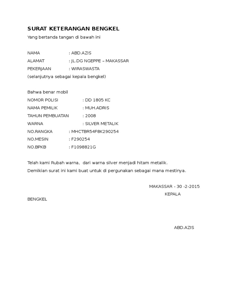 Surat pengalaman kerja ini berguna sebagai bukti bahwa seseorang itu sudah memiliki pengalaman kerja di bidang tertentu sesuai dengan yang tertera pada surat pengalaman kerja. Kali ini saya akan share contoh surat keterangan gantirubah warna dan bentuk kendaraan motor mobil dari bengkeljika anda ingin merubah warna pada stnk kendaraan anda pastilah anda disuruh membuat surat keterangan perubahan warna ataupun bentuk dari bengel. Bahwa benar banar rusak di bengkel kami mulai tanggal 1 mei 2007 24 januari 2008.