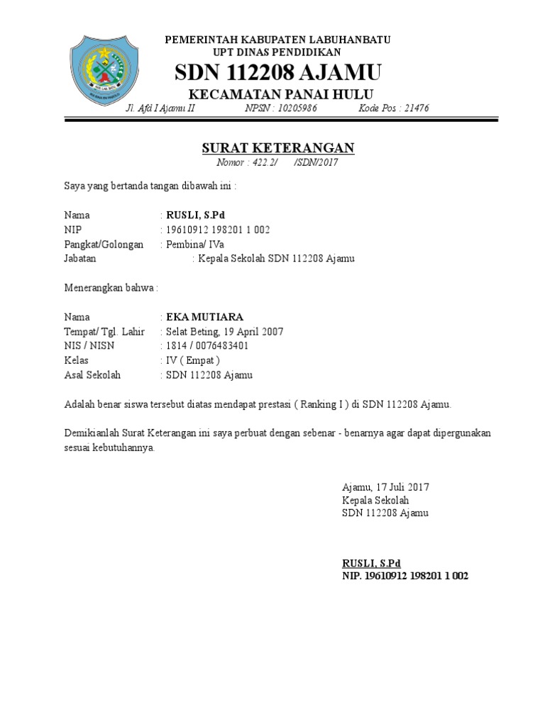 Contoh surat keterangan berprestasi. Berikut orang majalengka berikan contoh surat dinas. Biasanya surat ini menerangkan siswa yang memiliki ranking di kelasnya misalnya rank 1 2 3 atau bahkan ada yang menerangkan siswa sampai rank 10. Biasanya surat ini menerangkan siswa yang memiliki ranking di kelasnya misalnya rank 1 2 3 atau bahkan ada yang menerangkan siswa sampai rank 10. Contoh surat pernyataan siswa. Di sekolah tentunya ada siswa yang berprestasi dari sekian banyak siswa dan terkadang ada pihak terkait yang membutuhkan siswa berprestasi dengan membuat surat keterangan dari kepala sekolah yang bersangkutan untuk kepentingan tertentu. Sebagai bahan referensi kami sajikan contoh surat keterangan siswa peserta didik berprestasi terbaru surat tersebut di buat dengan microsoft word atau berformat doc sehingga dapat bapak ibu guru yang bertugas sebagai panitia ppdb tahun ajaran 20192020 dapat memodifikasinya dengan mudah untuk disesuaikan dengan sekolahmardasah bapak dan ibu dewan guru bersatmikal.