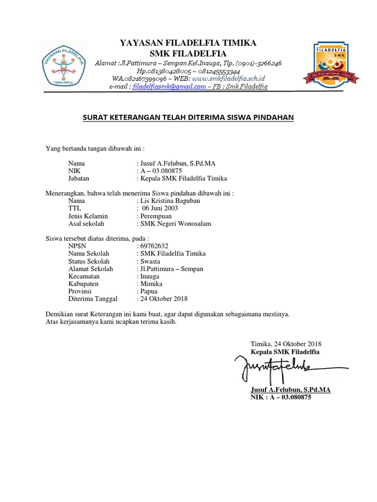 Contoh surat keterangan diterima di sekolah. Sebagai contoh surat keterangan diterima di perguruan tinggi atau surat keterangan aktif sebagai pegawai di sebuah dinas. Demikian surat keterangan penerimaan siswa pindahan ini di buat untuk dapat di. Surat keterangan penerimaan mutasi masuk nomor. Newer post older post. Sesuai dengan surat keterangan pindah madrasah yang bapakibu kirimkan kepada kami. Surat keterangan tidak menggunakan gedung atau fasilitas negara atau pemerintah yang dibuat oleh kepala sekolah.