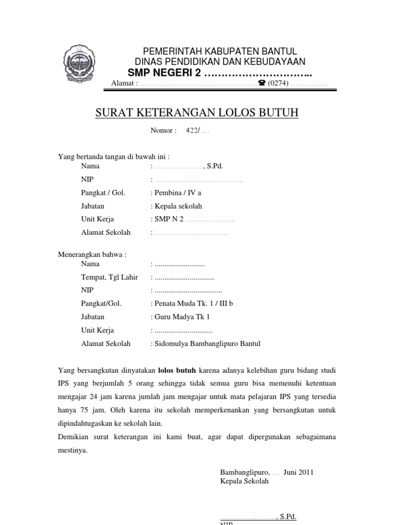Contoh surat keterangan lolos butuh. Contoh permohonan mutasi pegawai. Kalau yang mutasi istri ikut suami maka bisa ditambahkan pada lampiran surat keterangan kerja suami atau surat surat penting lainya jika diperlukan. Untuk mutasi istri ikut suami maka bisa ditambahkan pada lampiran surat keterangan kerja suami atau surat surat penting lainya jika diperlukan. Sekali lagi saya ingatkan untuk contoh surat mutasi pns lolos butuh diatas redaksi bahasanya bisa disesuaikan dengan kondisi masing masing. Contoh surat lolos butuh mutasi pnssurat lolos butuh dikeluarkan oleh sekolah asal yang menyatakan bahwa sekolah tersebut mengizinkan guru untuk pindah dengan pertimbangan umumnya yaitu kelebihan guru dengan mata pelajaran yang bersangkutan. Maret 2014 49 februari 2014 3 januari 2014 6 2013 99 desember 2013 1 november 2013 16 agustus 2013 6.