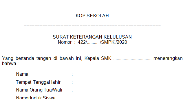 Contoh surat keterangan lulus smk. Surat keterangan lulus sementara smk kurikulum 2013 download perhatian. Bapakibu kepala smasmk negeri dan swasta. Surat resmi yang dibubuhi tanda tangan kepala sekolah atau rektor ini dibutuhkan oleh mereka mereka yang sudah lulus smk atau kuliah dan akan mencari kerja secepatnya. Download format surat keterangan lulus skl 2020 un sesuai dengan surat edaran kepala dinas pendidikan dan kebudayaan provinsi jawa tengah nomor 443209007 tanggal 24 april 2020 tentang penyelenggarann kbm daring dan penetapan tanggal kelulusan peserta didik pada satuan pendidikan smasmk smalb smplb dan sdlb provinsi jawa tengah yang isinya antara lain sebagai berikut. Surat resmi yang dibubuhi tanda tangan kepala sekolah ini dibutuhkan oleh mereka mereka yang sudah lulus sd smp atau sma dan ingin segera melanjutkan sekolahnya ke jenjang yang lebih tinggi. Surat resmi yang dibubuhi tanda tangan kepala sekolah ini dibutuhkan oleh.