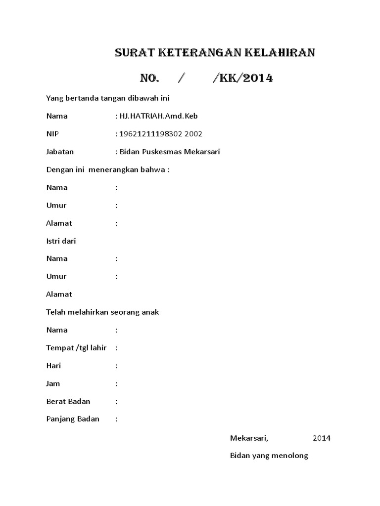 Silakan download contoh surat keterangan kelahiran dari bidan di atas dalam format msword yang sudah di format 1 lembar bisa jadi 2 surat keterangan. Surat keterangan kelahiran dari kelurahan adalah merupakan surat keterangan dari kepala desa yang menjelaskan tentang kelahiran seorang bayi. Penulisan surat izin cuti melahirkan tidak jauh berbeda dengan penulisan berbagai jenis dan contoh surat cuti lainnya. Namun jika memungkinkan anda bisa melampirkan surat keterangan hasil pemeriksaaan bidan atau dokter kandungan pada saat mengajukan contoh surat cuti melahirkan tersebut. You might also like.