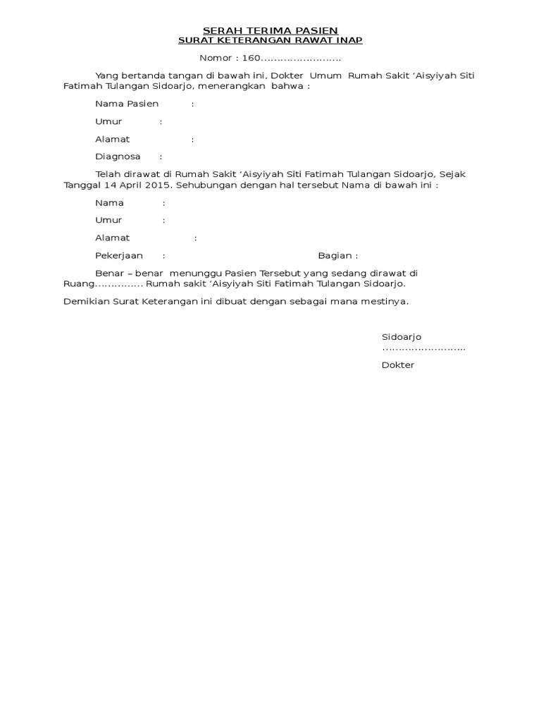 Contoh surat keterangan rawat inap. Ketika penyakit yang anda derita lumayan parah maka mungkin saja membutuhkan tindakan rutin dan lebih lanjut dari pihak rumah sakit. Anda pun harus menginap di rumah sakit untuk bisa mendapatkan penanganan yang lebih maksimal dari para petugas medis disana. Fill out securely sign print or email your contoh surat keterangan rawat inap rumah sakit form instantly with signnow. Surat ini merupakan contoh dari surat resmi dimana penulisan dan penggunaan bahasa yang harus sesuai dengan ejaan yang disempurnakan. Form surat pernyataan jaminan pembiayaan dari perusahaan pada karyawannya yang sakit akan dibubuhi meterai rp6000 dan dicap perusahaan. Skd rawat inap.