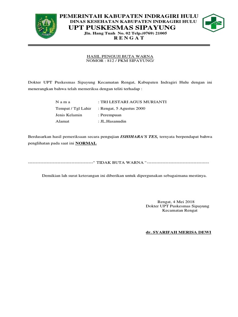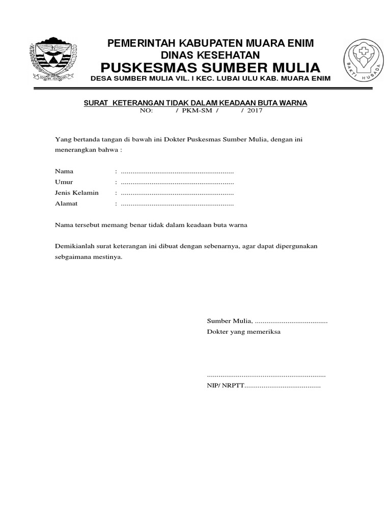 Dan surat ini bisa diperoleh dari rumah sakit klinik atau dokter yang memiliki praktek sendiri. Contoh surat keterangan sehat dari puskesmas. Suka maju 08 april 2020. Surat ini sangat penting karena merupakan salah satu persyaratan yang diminta dan harus dilengkapi. Surat ini menjadi salah satu dokumen pelengkap yang harus dimiliki jika mendaftar pada instansi atau perusahaan tertentu. Sekedar tau aja ya pak mas dan teman teman semua inilah contoh surat buta warna contoh surat pernyataan tidak buta warna kemenkumham contoh surat keterangan tidak buta warna dari dokter contoh surat keterangan tidak buta warna dari rumah sakit contoh surat keterangan tidak buta warna dari puskesmas contoh surat tidak buta warna contoh surat keterangan buta warna contoh surat.