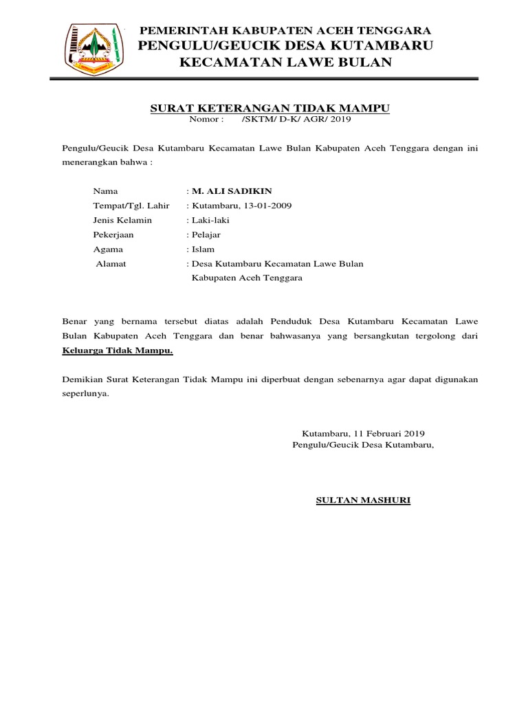 Contoh surat keterangan tidak mampu dari desa. Contoh surat keterangan tidak mampu dari desa ketua rw ketua rt surat keterangan desember 18 2019 0633 surat keterangan tidak mampu merupakan surat yang dibuat untuk menyatakan atau menerangkan bahwa seseorang kurang mempunyai kemampuan atau kelebihan dalam aspek materiil di kehidupannya. Surat keterangan tidak mampu berikut ini anda bisa lansung copypaste contoh surat keterangan miskin tidak mampu dari kepala desa ini untuk kelengkapan. Dari ketiga contoh di atas memang tidak memiliki terlalu banyak perbedaan namun ada beberapa poin yang dapat menjadi bahan perbandingan dalam menyusun suatu surat keterangan tidak mampu. Surat keterangan tidak mampu ialah sebuah surat yang dibuat dan dikeluarkan dari pihak yang berwenang ketua rt ketua rw kepala dusun kelurahan kepala desa sekolah dan lainnya untuk dapat menerangkan bahwa warganya yang telah disebutkan dalam surat tersebut merupakan salah satu warga yang tidak mampu yang berdomisili di daerah tertentu. Demikian beberapa contoh surat keterangan tidak mampu yang dapat saya cantumkan dalam artikel kali ini.