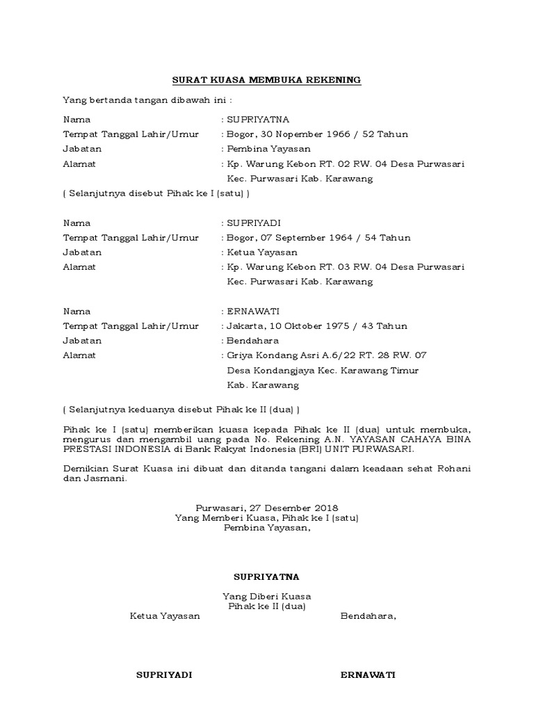 Contoh surat kuasa pembukaan rekening bank bri. Berikut ini anda bisa lansung copypaste contoh surat permohonan pembuatan pembukaan rekening bank bri semoga contoh surat ini dapat melengkapi administrasi anda. Demikianlah contoh surat permohonan pembukaan rekening gampong desa. Berbagai keperluan bank yang diwakilkan kepada orang lain semuanya harus menggunakan surat kuasa dari pemberi wewenang kepada penerima wewenang misalnya saja seperti penarikan uang tunai dari rekening bank melalui teller. Melakukan penyetoran uang pada bank serta menerima tanda terima pembayarannya kwitansi. Melakukan penyetoran uang pada bank serta menerima tanda terima pembayarannya kwitansi. Surat kuasa pembukaan rekening yayasan.