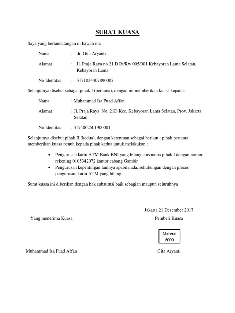 Surat kuasa ini saya buat supaya bisa dipergunakan sebagaimana mestinya. Dalam mengurus hal hal di bank terkadang kamu akan membutuhkan surat kuasa. Jangan lupa tambahkan materai 6000 satu buah saja di tengah tengah tanda tangan kedua belah pihak dan ditandatangani oleh kedua belah pihak tersebut. Materai inilah sebagai penguat hukum dan harus disertakan. Contoh surat kuasa untuk pengambilan atm mohon solusi nya min atm keponakan saya terblokir gra2 sya slh msukin pin 3 x brturut2 dan ponakan sya brda di malaysia atm ny dipercayakn penuh kpda sya utk mengirim kpda org tua nya di kampung persoalan nya sya tdk bisa reset pin tsb krna sya bkn pemilik asli pihak bank menyarankan agar membuat surat kuasa bagaimana mau buat surat kuasa jika. Contoh surat kuasa bank bri bca btn bni mandiri berbagai keperluan yang baik dan benar.