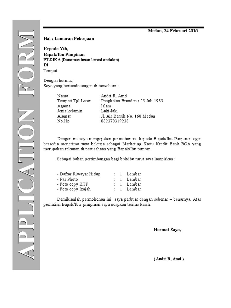 Hampir semua bank sebenarnya memiliki kriteria penilaian ayang sama terhadap surat lamaran dan juga berkas berkas yang lainnya yang digunakan untuk melamar sebuah pekerjaan. Jika anda sedang mencari refrensi surat lamaran kerja lainnya bisa lihat postingan kami sebelumnya. Contoh surat lamaran kerja bank bca. Contoh surat lamaran kerja di. Contoh surat contoh surat lamaran yang baik 2016. Nah yang biasa membedakannya adalah bergantung pada masing masing individu yang ingin melamar pekerjaan dengan bahasa nya masing masing.