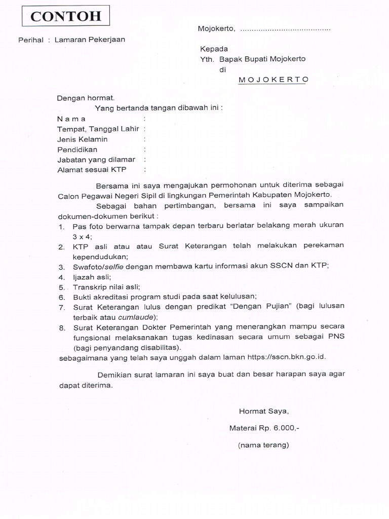 Tenaga kesehatan guru tenaga teknis pendaftaran calon pegawai negeri sipil atau cpns 2019 resmi dibuka 11 november 2019 lalu. Contoh surat lamaran kerja cpns terbaru 2015 buat anda yang ingin melamar kerja di cpns maka membuat surat lamaran tidak boleh asal buat saja dan ada setruktur yang harus anda ketahui juga maka dengan ini kami blog contoh surat dan proposal memberikan info ini buat anda semua supaya anda bisa di terima lamaran kerja cpns anda nantinya. Berdasarkan contoh surat lamaran cpns 2019 yang dibagikan oleh beberapa instansi pusat dan daerah rata rata surat itu memuat beberapa informasi di antaranya yaitu nama pelamar jenis kelamin jenjang pendidikan. Sebenarnya calon peserta seleksi cpns juga bisa mengunduh melalui images for contoh surat lamaran cpns 2018.