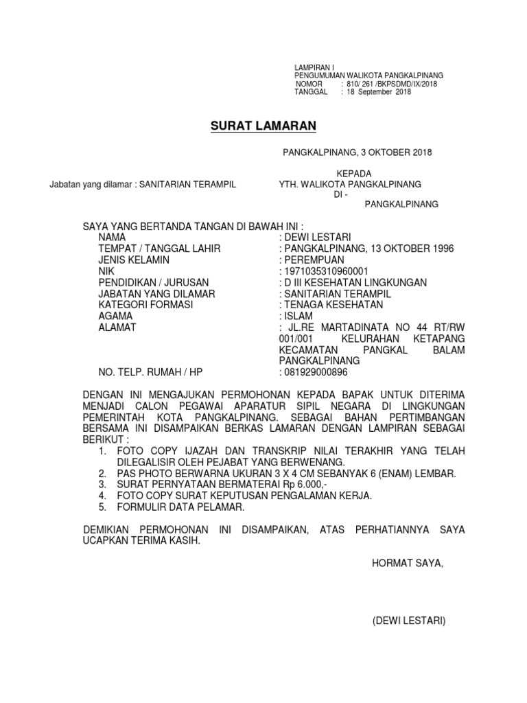 Contoh surat lamaran cpns untuk walikota. Isi surat lamaran itu sendiri tidak jauh berbeda. Yang penting nyantumin formasi yang dilamar dan kualifikasi pendidikan pelamar ujar kepala. Berikut link download surat lamaran cpns pemkot surabaya. Pendaftarn cpns pemkot surabaya tersedia untuk berbagai kualifikasi lulusan mulai sma sampai s2. Contoh surat lamaran kerja cpns terbaru 2015 buat anda yang ingin melamar kerja di cpns maka membuat surat lamaran tidak boleh asal buat saja dan ada setruktur yang harus anda ketahui juga maka dengan ini kami blog contoh surat dan proposal memberikan info ini buat anda semua supaya anda bisa di terima lamaran kerja cpns anda nantinya. Surat lamaran adalah surat resmi yang ditujukan kepada sebuah perusahaaninstansi dengan tujuan untuk mengajukan diri sebagai pekerja atau dalam hal pns adalah abdi negara.
