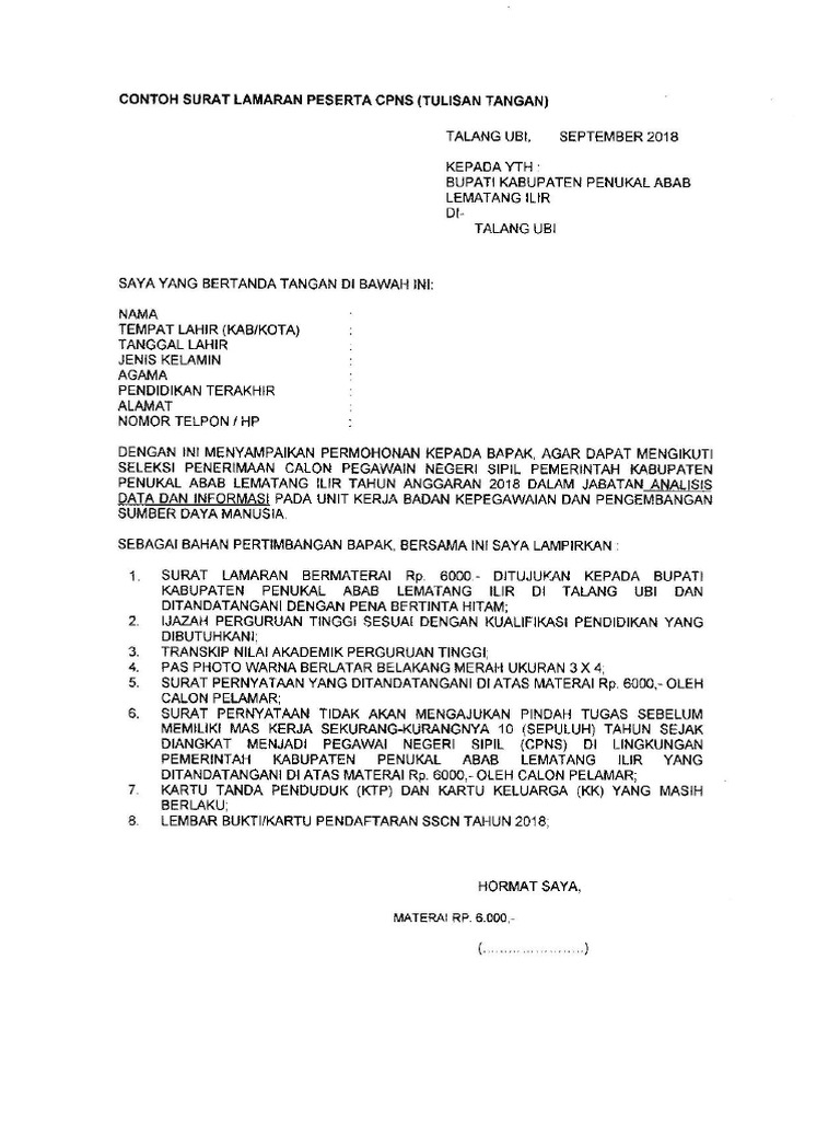 Download contoh surat lamaran dan pernyataan seleksi cpns kejagung 2019 word. Tribun timurcom berikut informasi contoh surat lamaran dan surat pernyataan cpns 2019 kemenkumham sma smk diploma s1 s2 format pdf teks. Format surat lamaran cpns kemenag 2019 dan surat pernyataan pelamar 3. Contoh resmi surat lamaran cpns ini dapat anda gunakan sebagai pedoman. Daftar online cpns pendaftaran cpns kementerian hukum dan ham terbaru format terbaru contoh surat lamaran slta d3 d3 papua s1 s1 papua di cpns kementerian hukum dan ham tahun 2017 pendaftaran calon pns tahun 2017 sudah dibuka pada hari selasa lalu yaitu instansi kementerian hukum dan ham yang mana membuka penerimaan sebanyak 17962 formasi. Tirtoid pendaftaran cpns 2019 kemendikbud formasi lulusan sma yang telah dibuka pada 13 27 november 2019 mewajibkan pelamar mengunggah dokumen surat lamaran dan pernyataan ke portal sscasn bkn.