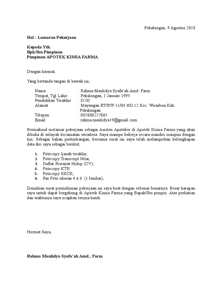 Contoh surat lamaran kerja asisten apoteker. Contoh surat lamaran kerja apoteker ke lima adalah membuat surat lamaran dengan bahasa inggris. Dengan surat ini saya bertujuan untuk melamar pekerjaan menjadi asisten apoteker di apotik sederhana menggantikan asisten yang sebelumnya mengundurkan diri dari apotik sederhana. Tapi jika lowongan. Contoh surat lamaran kerja asisten apoteker iii. Contoh surat lamaran kerja farmasi di rumah sakit ataupun di apotek yang baik dan benar serta dapat digunakan agar terlihat profesional. Contoh surat lamaran kerja apoteker dalam bahasa inggris contoh surat lamaran kerja apoteker ke lima adalah membuat surat lamaran dengan bahasa inggris.