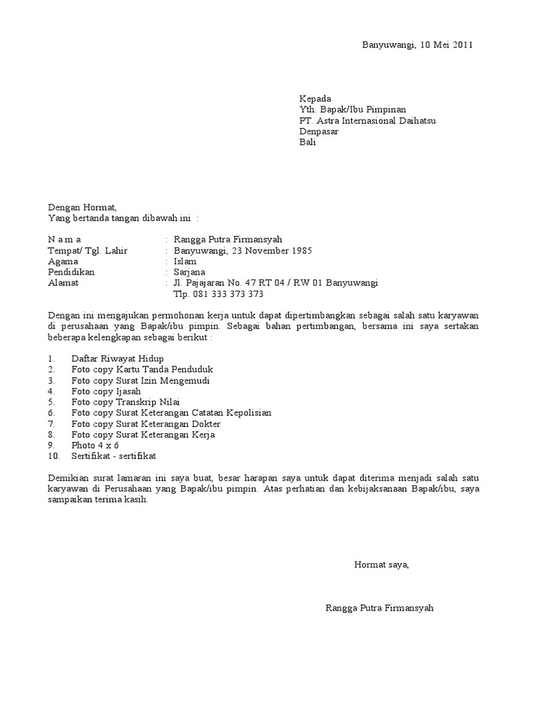 Contoh surat lamaran kerja astra. Surabaya 01 desember 2018. Contoh surat lamaran kerja astra posisi sales. Contoh surat lamaran kerja astra posisi sales. Jenderal sudirman kav 5 6. Perusahaan ini mempunyai manajemen pemasaran yang ditangani penuh oleh pt astra international tbk. Contoh surat lamaran kerja astra honda motor contoh surat lowongan kerja di astra group salah satu tempat kerja written by della yulischa november 15 2019 add comment older posts home.