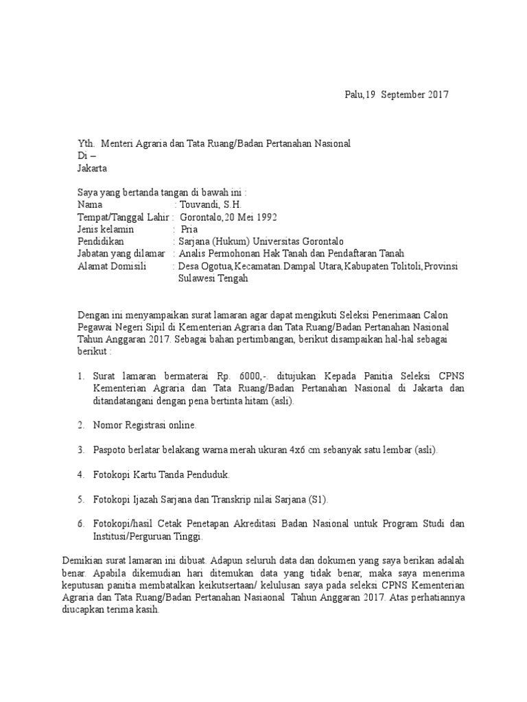 Contoh Surat Lamaran Cpns Badan Pertanahan Nasional Bagi