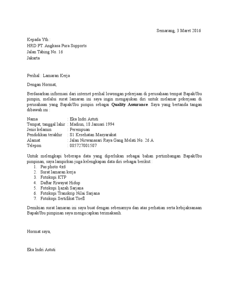 Dalam menulis sebuah surat lamaran ada beberapa poin penting yang tidak boleh dianggap sepeleh. Bapak eko juniarka pt jaya abadi di surabaya dengan hormat berdasarkan informasi dari instagram lokerid pada tanggal 18 mei 2018 tentang lowongan sebagai mekanik di bengkel.