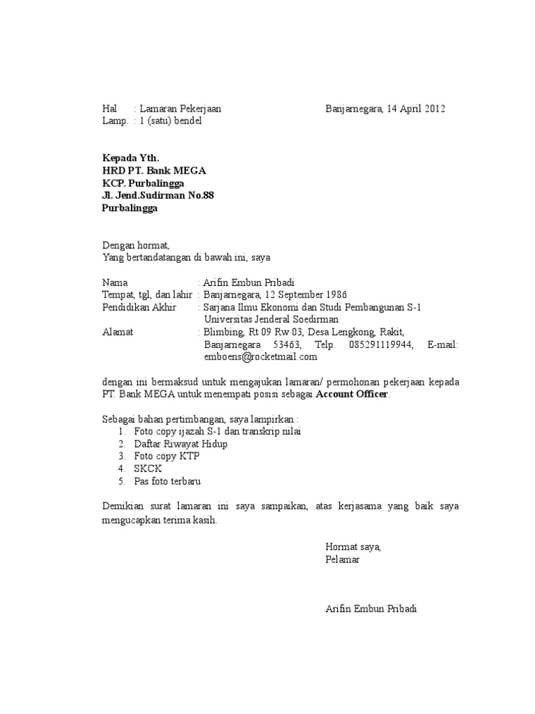 Contoh surat lamaran kerja di bank terlengkap dan terupdate 2020. Contoh surat lamaran umum di bank di internet ada banyak sekali paduan contoh surat lamaran kerja yang baik dan benar serta sesuai dengan kriteria kriteria yang seharusnya. Hingga tahun 2015tercatat karyawan di bank mega lebih dari 8500 orang. Namun sebelum itu pada postingan sebelumnya admin sudah membagikan contoh surat lamaran kerja di bank bri. Berikut ini adalah contoh surat lamaran kerja yang ditunjukan untuk lowongan kerja di bank sebagai contoh surat lamaran kerja ini di tunjukan untuk bank cimb niaga finance di bandar lampung. Mengenai contoh surat lamaran kerja di bank sebenarnya sudah banyak yang membagikannya di internet anda tinggal mencari dan menseleksi yang mana menurut anda paling sesuai dengan kebutuhan anda.