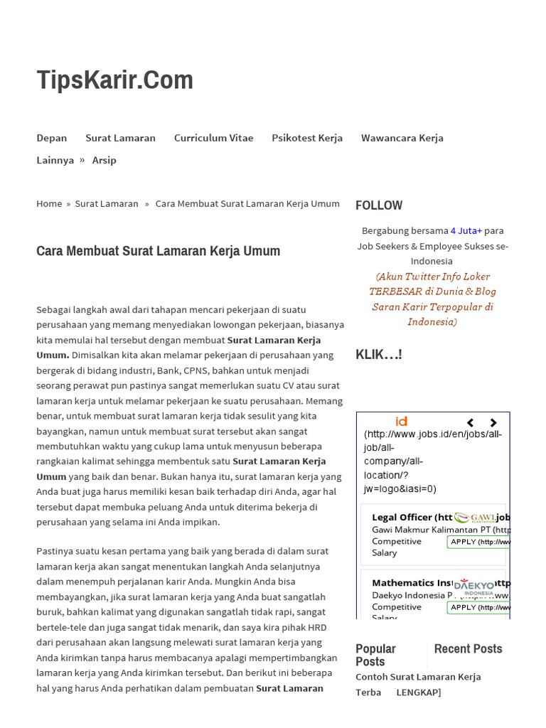 Mungkin terdapat jutaan artikel di internet yang menyediakan panduan bagaimana cara membuat surat lamaran pekerjaan yang disertai contoh surat lamaran pekerjaan baik itu surat lamaran kerja untuk melamar ke perusahaan maupun surat lamaran pekerjaan. Baik itu iklan di media cetak surat kabar radio dan televisi. Contoh surat lamaran kerja ini saya buat kepada para pencari kerja agar bisa digunakan untuk melamar pekerjaan diperusaaan sesuai dengan posisi yang dibutuhkan oleh perusahan yang sedang membuka lowongan pekerjaan. Apalagi jika mendapatkan pekerjaan di perusahaan bergensi dengan skala nasional atau international.