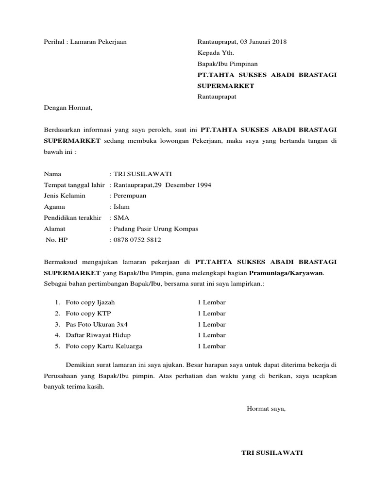 Contoh surat lamaran kerja di swalayan. 15 contoh surat lamaran kerja spg spb atau pramuniaga di counter hp swalayan mall dan toko surat lamaran kerja mei 09 2020 0708 contoh surat lamaran kerja spg dalam meningkatkan jumlah penjualan suatu merk produk perusahaan akan membuat sistem marketing yang menarik. Contoh surat lamaran kerja di toko swalayan tulis tangan. Berbagai restoran tempat kopi dan minuman kekinian bisa ditemukan dengan mudah dimanapun. Berbicara mengenai tugas karyawan toko memang bisa dibilang gampang gampang susah pasalnya selain harus bisa membentuk kepercayaan pelanggan. Shofiatun tempat tanggal lahir. Jangan sampai sudah membuat surat lamaran kerja capek capek sudah foto copy sana sini ternyata kertas yang dipakai sudah kusut atau terkena air dan bekasnya terlihat jelas ini akan sangat membuat pihak perusahaan atau pemilik toko tidak suka dengan cara anda membuat surat lamaran kerja karyawan toko karena anda dengan begitu akan dinilai tidak menghargai dan meremehkan jenis pekerjaan anda.