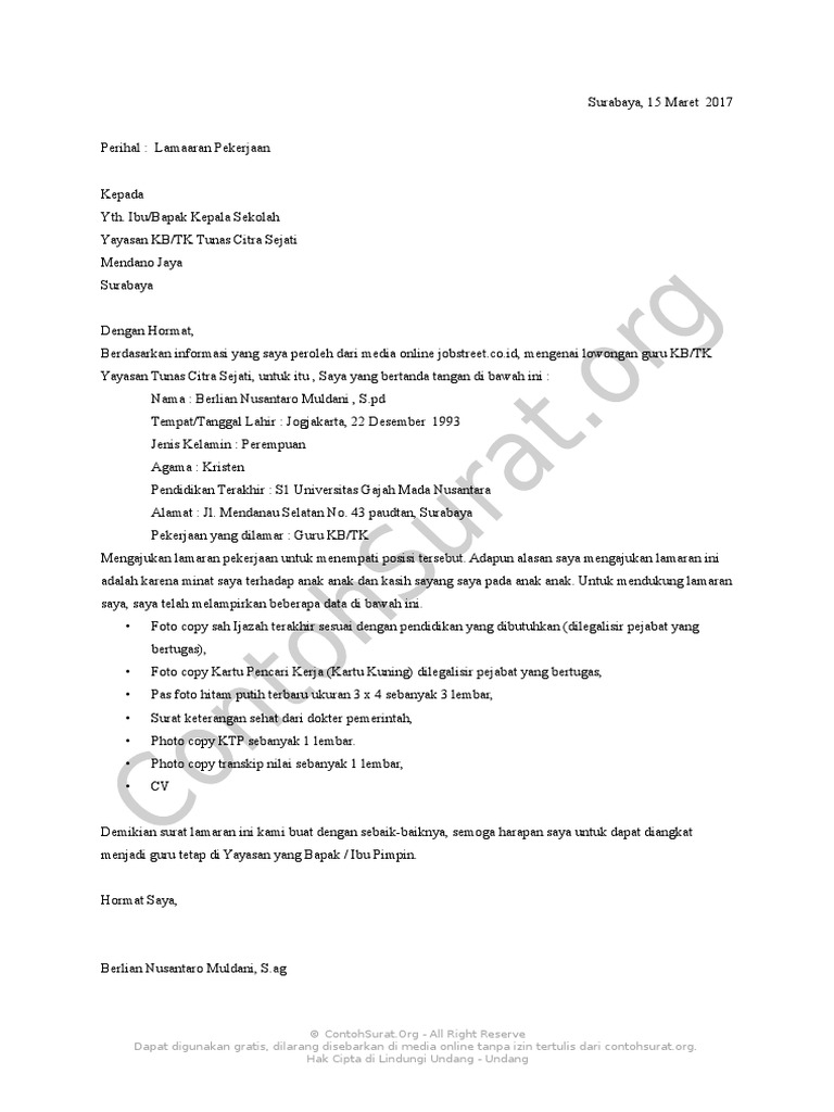 Langsung saja silahkan contoh surat lamaran kerja untuk guru tk atau paud dibawah ini dan bisa langsung di download dalam bentuk doc maupun pdf jadi sobat tinggal print atau di tulis tangan kembali. Contoh surat lamaran kerja untuk guru tk dibawah ini dibagi menjadi lima sesaui informasi lowongan kerja yang didapat. Baik itu iklan di media cetak surat kabar radio dan televisi. Contoh surat lamaran kerja di perusahaan seringkali dicari oleh para pencari kerja yang ingin mengajukan lamaran pekerjaan di perusahaan perusahaan yang ada di indonesia. Surat lamaran kerja dibutuhkan guna melamar pekerjaan baru untuk kamu yang baru lulus kuliah pindah kerja cari suasana. Mungkin terdapat jutaan artikel di internet yang menyediakan panduan bagaimana cara membuat surat lamaran pekerjaan yang disertai contoh surat lamaran pekerjaan baik itu surat lamaran kerja untuk melamar ke perusahaan maupun surat lamaran pekerjaan.